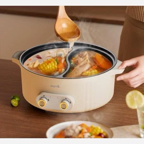توضیحات قابلمه برقی 2 محفظه 6 لیتری مدل Deerma DG50W Deerma DG50W علیرغم داشتن ساختار یک گلدانی، دو طعم منحصر به فرد را به لطف طراحی دو محفظه ای ارائه می دهد که به رضایت کامل طعم لذت بردن از قابلمه در خانه برای همه اعضای خانواده کمک می کند. با این طرح میتوانید قابلمهای تند، غیر تند، خنک یا خوشطعم را بهطور انعطافپذیر تهیه کنید و اطمینان حاصل کنید که هم برای بزرگسالان و هم برای کودکان مناسب است. به ویژه ریخته گری بدون درز بدون جوش بین پارتیشن و بدنه قابلمه جدا شدن کامل و عدم نشتی یا ترک را پس از مدت طولانی استفاده ، تضمین می کند. کاربران می توانند مطمئن باشند که این دو طعم قابلمه با هم مخلوط نمی شوند. Deerma DG50W مجهز به 2 دستگیره تنظیم دما مستقل قسمت جلویی مجهز به دو دستگیره تنظیم دما مستقل است که هر دسته برای یک محفظه قابلمه گرم می باشد. کاربران فقط باید دستگیره را بچرخانند تا به راحتی ظرفیت پخت جداگانه برای هر محفظه را سفارشی کنند. این طراحی به شما امکان می دهد بدون تأثیر بر دمای محفظه مجاور سرخ، هم بزنید، خورش و بجوشانید و در نتیجه تمام نیازهای مختلف پخت را برآورده کنید. علاوه بر این، طراحی دستگیره کنترل با قابلیت تنظیم انعطاف پذیر بین دو سطح حرارت، به شما کمک می کند آتش را به طور دقیق برای هر یک از مواد پخت کنترل کنید. اگر سطح 1 برای خورش در دمای پایین 500 وات مناسب باشد، سطح 2 برای طبخ قابلمه داغ و غذاهای سرخ شده در دمای بالای 1000 وات مناسب خواهد بود. ظرفیت2000 واتی Deerma DG50W ، گرمایش سریع، صرفه جویی در زمان در آشپزخانه قابلمه Deerma 6L از سیستم گرمایش مدرن با ظرفیت کلی تا 2000 وات استفاده می کند. به طور خاص، لوله های گرمایش در هر دو محفظه با ظرفیت 1000 وات در هر طرف به طور یکنواخت چیده می شوند. توانایی گرم کردن مستقل هر دو طرف را فراهم می کند، از گرمایش سریع و توزیع یکنواخت گرما پشتیبانی می کند، به پخت غذا در زمان کوتاه کمک می کند، در نتیجه هر بار که به آشپزخانه می روید باعث صرفه جویی در تلاش می شود. Deerma DG50W با ظرفیت 6 لیتر، نیازهای غذایی بسیاری از مردم را برآورده می کند قابلمه DG50W با ظرفیت 6 لیتر مجهز شده است، با طراحی قابلمه بالا عرضه می شود که برداشتن غذا را آسان تر می کند. قابلمه می تواند به راحتی نیازهای غذاخوری یک خانواده پرجمعیت را برآورده کند. علاوه بر این، قابلمه با ظرفیت زیاد به شما کمک می کند تا به راحتی از آن برای پخت انواع غذاها، از سرخ کردنی گرفته تا خورش، جوشاندن مقدار زیادی غذا استفاده کنید. Deerma DG50W با مواد نچسب با کیفیت بالا، ایمن برای استفاده برای تامین نیازهای مختلف آشپزی کاربران، قابلمه با یک لایه نچسب در داخل آن پوشانده شده است. این به کاربران کمک می کند تا به راحتی غذاهای سرخ شده را بدون نگرانی از چسبیدن قابلمه بپزند و همچنین تمیز کردن را آسان تر می کند. کاربران حتی می توانند تمیزی دیگ را فقط با پاک کردن آن با حوله احساس کنند. به طور خاص، درب آن از شیشه ای با استحکام بالا، مقاومت موثر در برابر ترک خوردگی و طراحی شفاف استفاده می کند که به شما کمک می کند به راحتی متوجه شوید که دیگ داغ در حال جوشیدن است. دارای یک دستگیره عایق حرارتی پلاستیکی PP برای جلوگیری از سوختگی هر بار که درب قابلمه را بلند می کنید. پایه ضد لغزش، دسته های عایق در دو طرف و سیستم دفع حرارت نیز به طور کامل مجهز شده اند. علاوه بر این، ویژگی های حفاظتی مانند گرمای بیش از حد و ضد خشک شدن نیز یکپارچه شده است تا به طور خودکار در هنگام تمام شدن آب خاموش شود، از آتش سوزی و انفجار جلوگیری شود، به افزایش عمر قابلمه و همچنین تضمین ایمنی برای کاربران در طول زمان کمک می کند. مزایای استفاده از قابلمه 2 محفظه تنوع غذاها: می توانید غداهای تند و ترش را به طور همزمان بپزید که برای بسیاری از افراد مناسب است. صرفه جویی در زمان و تلاش: نیازی به پخت دو قابلمه مجزا نیست، فقط یک قابلمه برقی 2 محفظه ای کافی است. مناسب برای مهمانی ها: برای مجالس خانوادگی و دوستانه بسیار مناسب ا