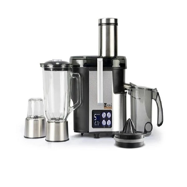 معرفی آبمیوه گیر ناسا الکتریک NS-945 آبمیوه گیری ناسا الکتریک NS-945 محصولی کاربردی و چند کاره است، که از کاربردها و قابلیتهای زیادی پشتیبانی میکند. چند کاره بودن این دستگاه به عملکردهای آبمیوه گیر، آب مرکبات گیر، آسیاب و مخلوط کن اشاره دارد. تمام این قابلیتها در یک دستگاه جمع شدهاند و از آن محصولی همه کاره ساختهاند. این آبمیوه گیری با کیفیت دارای موتوری قدرتمند با حداکثر توان 1500 وات بوده، که امکان حداکثر بهرهوری از این محصول را فراهم آورده است. قابلیت تنظیم سرعت در 5 سطح مختلف در کنار عملکرد پالس PULSE نشان از کارآیی بالای دستگاه دارد، که متناسب با نوع و ساختار مواد اولیه میتوانید سطح سرعت را انتخاب نمایید. یکی از ویژگیهای متمایز کننده آبمیوه گیری ناسا الکتریک NS-945 وجود کنترل پنل دیجیتالی بر روی بدنه آن است. نمایشگر دیجیتالی سرعت انتخابی و دمای داخلی دستگاه و حتی مواد اولیهای که با آن سرعت تناسب دارند را نمایش میدهد. همچنین چهار دکمه فیزیکی نیز در کنار نمایشگر وجود دارند، که برای روشن کردن و کاهش و افزایش سرعت و همچنین اعمال عملکرد پالس به کار میروند. در ساخت این محصول از دو جنس پر کاربرد پلاستیک AS و استیل ضد زنگ استفاده شده، که از کیفیت و مقاومت بالایی بهره میبرد. برای انتخاب و خرید آبمیوه گیری ناسا الکتریک کلیک کنید. مشخصات ظاهری آبمیوه گیری ناسا الکتریک NS-945 آبمیوه گیری چهار کاره ناسا الکتریک NS-945 دارای بدنهای از جنس استیل ضد زنگ و پلاستیک با کیفیت AS میباشد. ترکیب دو رنگ خاص نقرهای و مشکی برای این محصول باعث شده حس لوکس بودن را به دستگاه ببخشد. قفل ایمنی که برای این دستگاه در نظر گرفته شده، تا زمانی که تمامی قطعات در جای خود قرار نگیرند اجازه روشن شدن به آبمیوه گیری را نخواهد داد. دسته ایمنی نیز از جنس استیل ضد زنگ بوده و استحکام و امنیت دستگاه را افزایش داده است. درپوشی از جنس پلاستیک بر روی کاسهی میانی و صافی قرار میگیرد. این درپوش دارای مجرای ورودی میوه است که میوه و سبزیجات و... از طریق این دهانهی ورودی به سمت تیغه و صافی هدایت میشوند. مجرای ورودی میوه در این دستگاه از جنس استیل ضد زنگ بوده و دارای اندازه بزرگ 80 میلی متری است، که امکان آب گیری میوههای بزرگ را بصورت کامل و بدون نیاز به قطعه قطعه کردن فراهم آورده است. مخزن تفالهای که به بدنه اصلی چسبیده است، از جنس پلاستیک بوده و ظرفیت آن 2 لیتر میباشد. این ظرفیت بالا امکان آبگیری حجم زیادی از میوه را فراهم آورده است و نیاز به خالی کردن پی در پی مخزن تفاله نیست. پارچ آبمیوه این دستگاه از جنس پلاستیک شفاف بوده و ظرفیت آن 1 لیتر است. این پارچ با دستهای که دارد به سادگی بلند و جابجا میشود. همچنین درپوشی که بر روی آن قرار گرفته از نشستن گرد و غبار بر روی آبمیوه داخل پارچ جلوگیری میکند و هم اینکه مانع از ریخته شدن آبمیوه میشود. کنترل پنل دیجیتالی آبمیوه گیری NS-945 جذابیت ظاهری دستگاه به خاطر نمایشگر دیجیتالی LED بر روی بدنه است، که ظاهری حرفهای و مدرن به محصول بخشیده است. بر روی نمایشگر دیجیتالی سرعت انتخابی و دمای داخلی دستگاه و مواد اولیهی متناسب با سرعت انتخابی نیز به رنگ سفید و آبی نمایش داده میشوند. برای نمونه، زمانی که دستگاه را بر روی سرعت 5 قرار میدهید، بر روی نمایشگر نام موادی نظیر سبزیجات سخت، آناناس، مرکبات و میوههای نرم نمایش داده میشود و این به معنای این است که برای گرفتن آبمیوه و آب سبزیجات و این نوع میوهها از سرعت 5 استفاده نمایید. بر روی نمایشگر دمای داخلی دستگاه نیز نمایش داده میشود، که با افزایش مدت زمان استفاده و بالا رفتن دمای موتور، دمای نمایش داده شده نیز افزایش مییابد. چهار کلید با عملکرد فشاری برای این دستگاه آبمیوه گیر در نظر گرفته شده، که شامل کلید روشن و خاموش، کلید عملکرد پالس، کلید افزایش سرعت و کلید کاهش سرعت میشود. زمانی که آبمیوه گیر روشن باشد، اطراف این دکمهها نیز به رنگ آبی درمیآید و چراغ LED اطراف دکمهها روشن میشود. مخلو