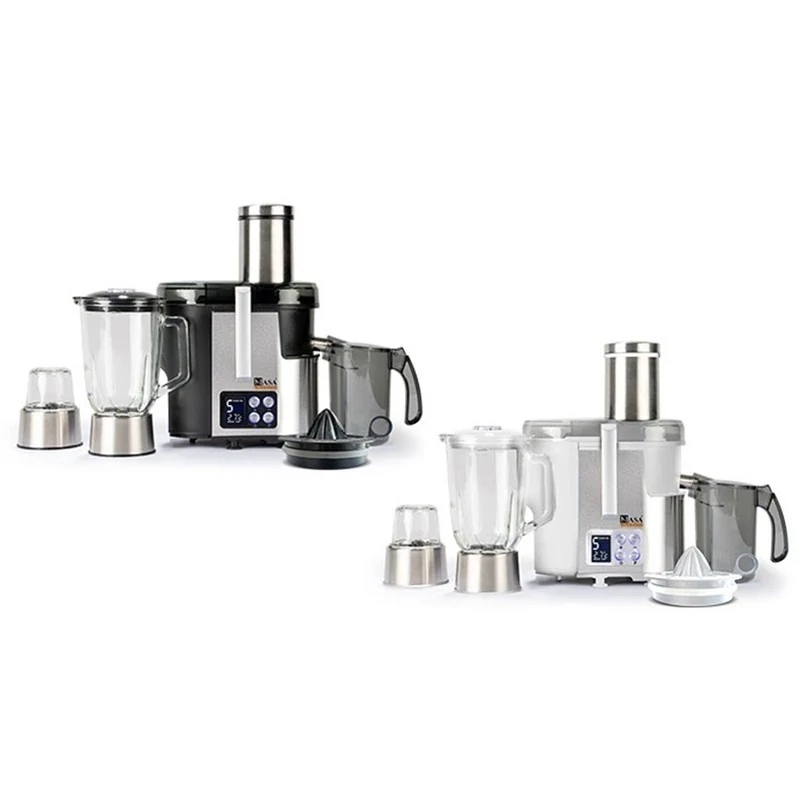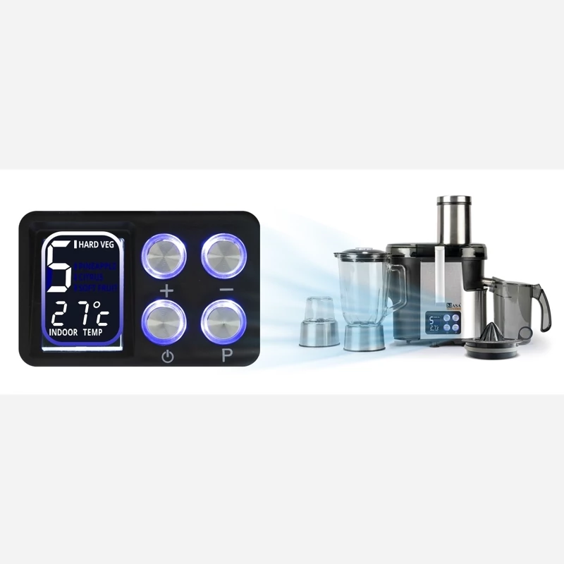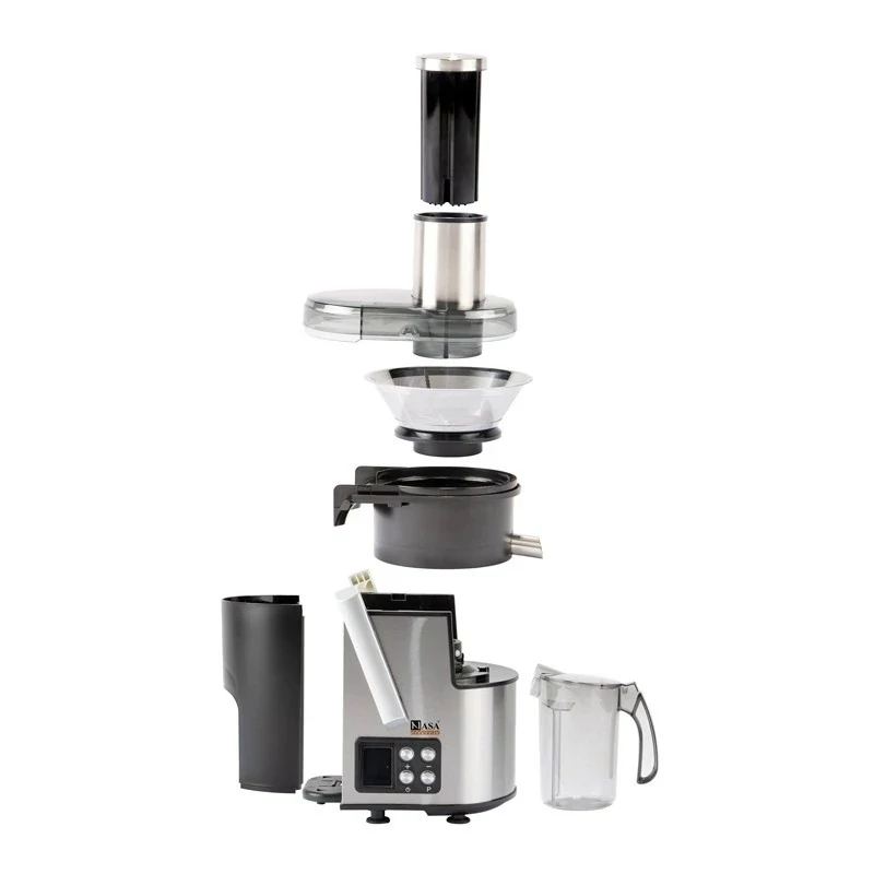 معرفی آبمیوه گیر ناسا الکتریک NS-945 آبمیوه گیری ناسا الکتریک NS-945 محصولی کاربردی و چند کاره است، که از کاربردها و قابلیتهای زیادی پشتیبانی میکند. چند کاره بودن این دستگاه به عملکردهای آبمیوه گیر، آب مرکبات گیر، آسیاب و مخلوط کن اشاره دارد. تمام این قابلیتها در یک دستگاه جمع شدهاند و از آن محصولی همه کاره ساختهاند. این آبمیوه گیری با کیفیت دارای موتوری قدرتمند با حداکثر توان 1500 وات بوده، که امکان حداکثر بهرهوری از این محصول را فراهم آورده است. قابلیت تنظیم سرعت در 5 سطح مختلف در کنار عملکرد پالس PULSE نشان از کارآیی بالای دستگاه دارد، که متناسب با نوع و ساختار مواد اولیه میتوانید سطح سرعت را انتخاب نمایید. یکی از ویژگیهای متمایز کننده آبمیوه گیری ناسا الکتریک NS-945 وجود کنترل پنل دیجیتالی بر روی بدنه آن است. نمایشگر دیجیتالی سرعت انتخابی و دمای داخلی دستگاه و حتی مواد اولیهای که با آن سرعت تناسب دارند را نمایش میدهد. همچنین چهار دکمه فیزیکی نیز در کنار نمایشگر وجود دارند، که برای روشن کردن و کاهش و افزایش سرعت و همچنین اعمال عملکرد پالس به کار میروند. در ساخت این محصول از دو جنس پر کاربرد پلاستیک AS و استیل ضد زنگ استفاده شده، که از کیفیت و مقاومت بالایی بهره میبرد. برای انتخاب و خرید آبمیوه گیری ناسا الکتریک کلیک کنید. مشخصات ظاهری آبمیوه گیری ناسا الکتریک NS-945 آبمیوه گیری چهار کاره ناسا الکتریک NS-945 دارای بدنهای از جنس استیل ضد زنگ و پلاستیک با کیفیت AS میباشد. ترکیب دو رنگ خاص نقرهای و مشکی برای این محصول باعث شده حس لوکس بودن را به دستگاه ببخشد. قفل ایمنی که برای این دستگاه در نظر گرفته شده، تا زمانی که تمامی قطعات در جای خود قرار نگیرند اجازه روشن شدن به آبمیوه گیری را نخواهد داد. دسته ایمنی نیز از جنس استیل ضد زنگ بوده و استحکام و امنیت دستگاه را افزایش داده است. درپوشی از جنس پلاستیک بر روی کاسهی میانی و صافی قرار میگیرد. این درپوش دارای مجرای ورودی میوه است که میوه و سبزیجات و... از طریق این دهانهی ورودی به سمت تیغه و صافی هدایت میشوند. مجرای ورودی میوه در این دستگاه از جنس استیل ضد زنگ بوده و دارای اندازه بزرگ 80 میلی متری است، که امکان آب گیری میوههای بزرگ را بصورت کامل و بدون نیاز به قطعه قطعه کردن فراهم آورده است. مخزن تفالهای که به بدنه اصلی چسبیده است، از جنس پلاستیک بوده و ظرفیت آن 2 لیتر میباشد. این ظرفیت بالا امکان آبگیری حجم زیادی از میوه را فراهم آورده است و نیاز به خالی کردن پی در پی مخزن تفاله نیست. پارچ آبمیوه این دستگاه از جنس پلاستیک شفاف بوده و ظرفیت آن 1 لیتر است. این پارچ با دستهای که دارد به سادگی بلند و جابجا میشود. همچنین درپوشی که بر روی آن قرار گرفته از نشستن گرد و غبار بر روی آبمیوه داخل پارچ جلوگیری میکند و هم اینکه مانع از ریخته شدن آبمیوه میشود. کنترل پنل دیجیتالی آبمیوه گیری NS-945 جذابیت ظاهری دستگاه به خاطر نمایشگر دیجیتالی LED بر روی بدنه است، که ظاهری حرفهای و مدرن به محصول بخشیده است. بر روی نمایشگر دیجیتالی سرعت انتخابی و دمای داخلی دستگاه و مواد اولیهی متناسب با سرعت انتخابی نیز به رنگ سفید و آبی نمایش داده میشوند. برای نمونه، زمانی که دستگاه را بر روی سرعت 5 قرار میدهید، بر روی نمایشگر نام موادی نظیر سبزیجات سخت، آناناس، مرکبات و میوههای نرم نمایش داده میشود و این به معنای این است که برای گرفتن آبمیوه و آب سبزیجات و این نوع میوهها از سرعت 5 استفاده نمایید. بر روی نمایشگر دمای داخلی دستگاه نیز نمایش داده میشود، که با افزایش مدت زمان استفاده و بالا رفتن دمای موتور، دمای نمایش داده شده نیز افزایش مییابد. چهار کلید با عملکرد فشاری برای این دستگاه آبمیوه گیر در نظر گرفته شده، که شامل کلید روشن و خاموش، کلید عملکرد پالس، کلید افزایش سرعت و کلید کاهش سرعت میشود. زمانی که آبمیوه گیر روشن باشد، اطراف این دکمهها نیز به رنگ آبی درمیآید و چراغ LED اطراف دکمهها روشن میشود. مخلو