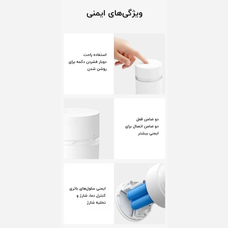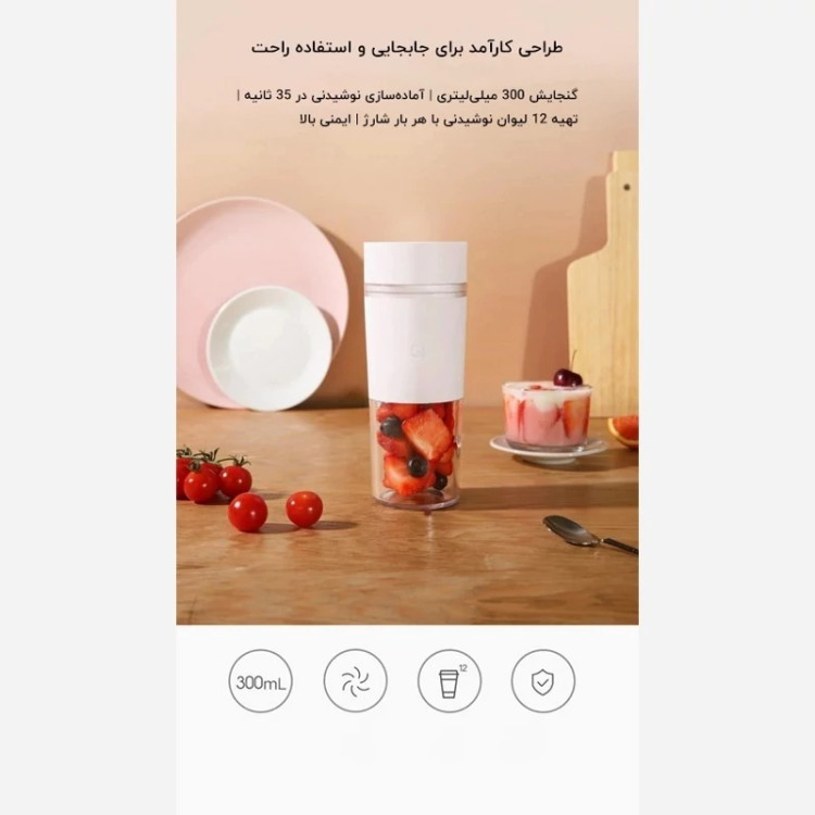 مخلوط کن شارژی چهار تیغه شیائومی مدل IPX6 ظرفیت 0.3 لیتر ، شیکر برقی بهترین انتخاب برای افرادی است که به دنبال یک میکسر پرقدرت برای درست کردن انواع اسموتی های خوشمزه و شیک کردن مکملهای ورزشی هستند. این بلندر شارژی دارای چهار تیغه فلزی استیل ضد زنگ پرقدرت بوده که قابلیت خرد کردن انواع مواد غذایی مانند میوه ها را داشته و دور موتور و استحکام تیغه های استیل ضد زنگ آن، قابلیت خرد کردن یخ را نیز به آن میدهد. شیکر برقی 4 تیغه شیائومی مدل IPX6 ، از پلاستیک سخت و فشرده تولید شده است و همچنین در تولید این شیکر از مواد سمی استفاده نشده است بنابراین برای افرادی که به جسم خود اهمیت می دهند گزینه مناسبی می باشد. همانطور که گفتیم هیچ ضرری برای بدنتان ندارد و بهداشتی است. شیکر شیائومی دارای 4 تیغه از جنس استیل ضد زنگ می باشد که علاوه بر این که ضد زنگ است قابلیت خورد کردن انواع میوهها را دارد. مشخصات مخلوط کن شارژی چهار تیغه شیائومی: دارای دو ضامن قفل دو ضامن اتصال برای ایمنی بیشتر دارای شارژ برقی (جهت شارژ باتری) قابلیت درست کردن اسموتی (مخلوط میوه ها، غذا ساز کودک، میکس مکمل و …) قابلیت ضد نشت قابلیت سیستم قطع خودکار قابل حمل و مناسب سفر شستشوی راحت (موتور از بدنه جدا می شود)