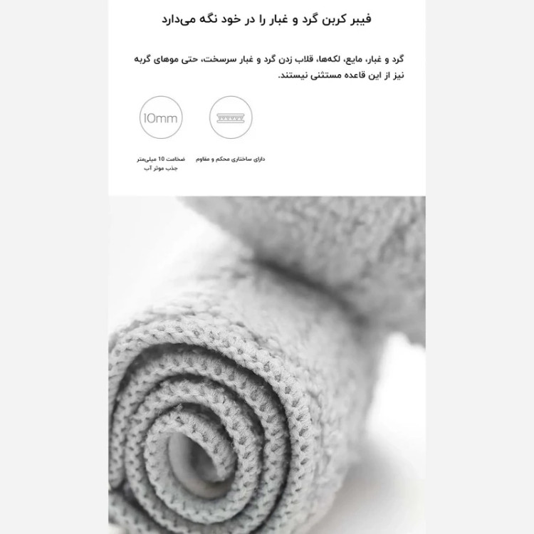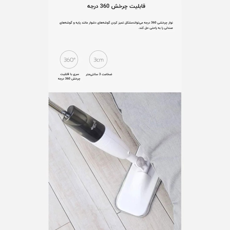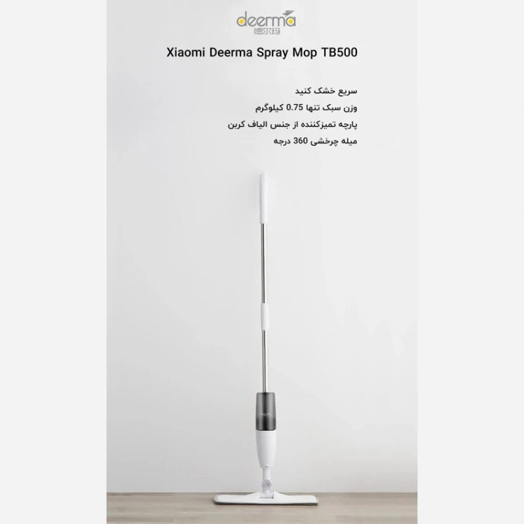 تِی کشیدن سطوح مختلف امری دشوار و خسته کننده است. زیرا شما مجبور هستید که دائما پد تِی زمین شوی را بشویید. همچنین گاهی اوقات لک آب روی سطوح باقی می ماند و ظاهری نامناسب را به خانه شما می دهد. با خرید تی زمین شوی اسپری دار شیائومی درما مدل TB500 دیگر این مشکلات را نخواهید داشت. این وسیله در کوتاه ترین زمان ممکن کف خانه یا محل کار شما را پاکیزه و درخشان می سازد. همچنین با استفاده از این وسیله دیگر نیازی نیست که نگران لغزنده شدن سطوح باشید. در این مقاله مشخصات و ویژگی های این محصول معرفی شده است. معرفی عملکرد تی زمین شوی اسپری دار شیائومی درما مدل TB500 زمین شوی درما مدل TB500 محصولی ایده آل برای کسانی است که به تمیزی کف خانه خود اهمیت می دهند. این وسیله کاربردی کار شستشو و تمیز کردن زمین را برای شما آسان می کند. هنگامی که از این کف شوی اسپری دار استفاده می کنید، آب روی زمین به صورت مه پاشیده می شود. یکی دیگر از قابلیت های زمین شوی شیائومی جمع کردن رطوبت حاصل از آب از روی زمین است. این ویژگی عاملی برای خشک شدن سریع کف به شمار می رود. بنابراین دیگر نیازی نیست که کودکان برای خشک شدن سطوح منتظر بمانند؛ آن ها بلافاصله می توانند به بازی خود بپردازند. همچنین از آنجایی که برای پاشیدن آب روی زمین از اسپری استفاده می شود، در مصرف آب نیز صرفه جویی می گردد. مشخصات ظاهری تی زمین شوی اسپری دار TB500 تی زمین شوی اسپری دار شیائومی مدل TB500 از طراحی ساده و مینیمال پیروی می کند. همچنین همه افراد می توانند به واسطه ساختار ارگونومیک این محصول به راحتی آن را در دست بگیرند. بدنه این دستگاه نیز از ترکیب پلاستیک مقاوم ABS و فلز و به رنگ سفید ساخته شده است. تی کف شوی اسپری دار کمپانی درما با وزنی برابر با 750 گرم ساخته شده است. جالب است که بدانید، این وزن معادل وزن سه سیب است. بنابراین حتی افراد لاغر نیز در حین استفاده از این محصول به دلیل وزن سبک آن دچار خستگی نمی شوند. همچنین در هنگام کار با این زمین شوی به کمر و شانه های شما فشار زیادی وارد نمی گردد. ابعاد این تی زمین شوی اسپری دار شیائومی درما مدل TB500 نیز بسیار جمع و جور و برابر با 124*355*120 سانتی متر است که به راحتی در محیط های کوچک نیز جا می شود و فضای زیادی را اشغال نمی کند. در ضمن وزن این دستگاه به گونه ای است که به سرعت می توانید کل یک اتاق را تِی بکشید. مخزن آب در نظر گرفته شده برای این دستگاه نیز ظرفیتی برابر با 350 میلی لیتر دارد. این ظرفیت به شما اجازه می دهد که محیطی به مساحت بیش از 100 متر مربع را تی بکشید. در این صورت نیازی نیست که دائما پد تی را آبکشی کنید. این موضوع علاوه بر افزایش سهولت روند نظافت سطوح باعث صرفه جویی در زمان شما نیز می شود. انتهای میله تی زمین شوی اسپری دار شیائومی درما مدل TB500 دو گیره برای نگهداری سر تی تعبیه شده است. 8 بخش قلاب مانند نیز در پشت تی وجود دارد که پارچه را به خوبی نگه می دارد. این نوع قرارگیری پارچه تمیزکننده به شما کمک می کند که کف زمین را به طور موثر تی بکشید. ویژگی های کف شوی شیائومی درما TB500 راه اندازی این زمین شوی درما نیز بسیار آسان است و در مدت زمان کوتاهی در عرض 1 ثانیه می توانید آن را آماده کار کنید. قدرت اسپری این محصول نیز به اندازه ای است که می تواند قطرات آب را تا فاصله 95 سانتی متری بپاشد. برای بدست آوردن منطقه اسپری گسترده و یکنواخت باید میله شستشو را تنظیم کنید. افزایش میزان محدوده پاشش آب باعث افزایش سرعت نظافت سطوح و صرفه جویی در وقت و انرژی شما می شود. این محصول از دسته لوازم خانگی شیائومی یک سری تی قابل چرخش 360 درجه با ضخامت 3 سانتی متر نیز تعبیه شده است. این قابلیت به شما کمک می کند که تی زمین شوی اسپری دار شیائومی درما مدل TB500 را در هر جهتی حرکت دهید. از این رو در حین نظافت تا حیطه 1.2 متری گوشه و کنارهای محیط را تمیز می کنید. بنابراین همه سطوح حتی زیر میز و مبل ها نیز به خوبی تمیز می شوند. همچنین علاوه بر آب امکان ریختن مواد ضدعفونی کننده یا شوینده های ر