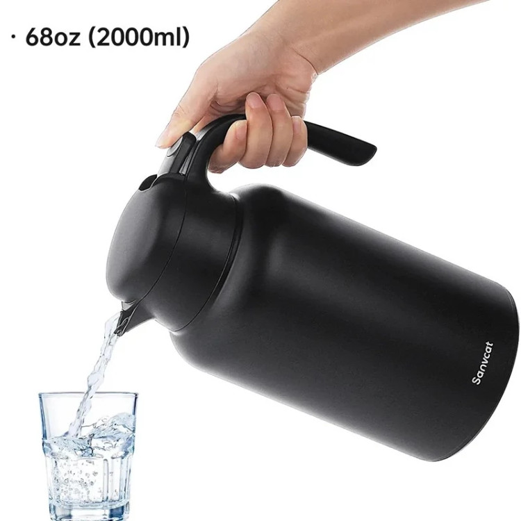 فلاسک SANVCAT مدل 2000ml با رنگ سفید و مشکی و دارای بدنه از جنس پلاستیک PP و مخزن از جنس فولاد ضد زنگ 304 و 316 است. این فلاسک دارای ظرفیت 2 لیتر بوده و برای نوشیدنیهای گرم وسرد مناسب است. مدت زمانی که این فلاسک میتواند دما را حفظ کند، حدود 24 ساعت است و میتواند دمای نوشیدنی را تا 68 درجه سانتیگراد نگه داردومدت زمانی که برای نوشیدنی سرد میتواند حفظ کند6ساعت دردمای 11درجه است.