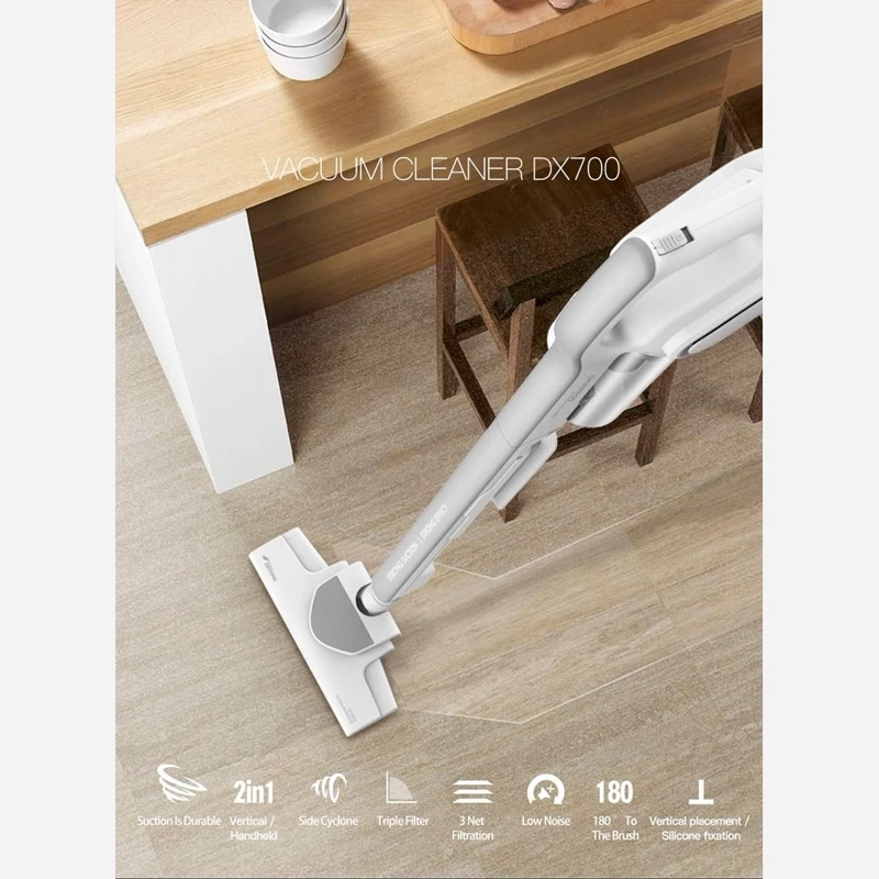 دیدگاه ها بررسی تخصصی Xiaomi DX700 Deerma Vacuum Cleaner افراد مختلف برای تمیز کردن منزل یا محل کار خود همواره به دنبال خرید تجهیزات با کیفیت و عملکرد عالی هستند. شما می توانید از جارو برقی شیائومی درما مدل Deerma DX700 به روش های مختلف برای نظافت تمام قسمت های خانه استفاده کنید. اگر دوست دارید که با این محصول کاربردی و فاکتورهای متمایزکننده آن آشنا شوید، تا انتها با ما همراه باشید. مشخصات ظاهری جارو برقی شیائومی درما مدل Deerma DX700 یکی از مشکلات جاروبرقیهای معمول سختی جابجا کردن بدنه سنگین آن ها است. همچنین لوله های بکار رفته در این نوع وسایل، محدودیت های بسیاری را برای حرکت دادن آن ها به وجود میآورند. با تولید و عرضه انواع جاروبرقی دستی دیگر نیازی نیست که برای هر آلودگی کوچکی از جاروبرقیهای بزرگ استفاده کنید. برای ساخت این وسیله از پلاستیک سبک و مقاوم ABS و پلی کربنات استفاده شده است. این مواد باعث افزایش استحکام، کاهش وزن و قیمت این محصول شده است. بنابراین جارو عصایی درما مدل DX700 در حالت ایستاده تنها 2.2 کیلوگرم وزن دارد. این در حالی است که هنگامی که این دستگاه را به صورت جارو دستی تغییر شکل دهید، وزن آن به 1.5 کیلوگرم کاهش می یابد. لازم به یادآوری است که این محصول در دو رنگ خاکستری تیره و سفید با ابعادی برابر با 1123*288*260 میلیمتر ساخته شده است. وزن سبک و ساختار ارگونومیک این جاروبرقی باعث شده است که در استفاده طولانی مدت فشار کمتری به کمر و شانه های شما وارد شود. در ضمن طراحی منحصربهفرد این مدل از جارو برقی درما امکان حرکت آن را در زوایای مختلف میسر می سازد. به همین دلیل شما حتی میتوانید گرد و غبار نشسته روی کاغذ دیواری و پرده های منزل خود را نیز بگیرید. در جارو برقی Deerma DX700 شیائومی یک مخزن زباله قابل جداسازی با ظرفیت 0.8 لیتر طراحی شده است. این میزان محفظه نگهداری زباله باعث می شود که شما نیازی به جابجایی جاروبرقیهای سنگین در خانه نداشته باشید. همچنین برای این وسیله نظافت هوشمند کابلی با طول 4.5 متر تعبیه شده است که حرکت در منطقه بزرگتری را فراهم میسازد. همچنین سه سَری مجزا نیز برای تمیز کردن سطوح مختلف، درزهای بین سرامیک ها و سطوح پارچه ای در بسته بندی این دستگاه قرار داده شده است. مشخصات جارو برقی شیائومی درما مدل Deerma DX700 طراحی دو در یک جارو برقی درما شیائومی مدل Deerma DX700 طراحی دومنظوره ( دو در یک ) جارو برقی درما Deerma DX700 از جمله مهمترین ویژگی های این محصول به شمار می رود. در واقع شما با خرید این دستگاه به دو جاروبرقی جداگانه با کاربرد متفاوت دسترسی پیدا می کنید. این جارو عصایی شیائومی را می توانید در حالت عادی برای تمیز کردن و گردگیری سطوح بزرگی مانند فرش و پارکت استفاده کنید. همچنین دسته بلند این وسیله به ارتفاع 1123 میلیمتر باعث می شود که تمیز کردن مکان های موجود در ارتفاعات مانند پرده، کانال کولر و سقف ها آسان باشد. وجود دسته ای با ارتفاع بلند جارو کشیدن مکان هایی با دسترسی دشوار همچون زیر کابینت ها، مبل و تخت را نیز آسان می سازد. البته امکان جدا کردن بخش اصلی جارو از قسمت لوله آن نیز وجود دارد. در این صورت می توانید از امکانات این جارو برقی 2 در 1 شیائومی DX700 به صورت جارو برقی دستی بهره ببرید. از این حالت برای تمیز کردن سطوح کوچک تری مانند کوسن های مبلمان، گوشه های دیوارها و جمع کردن زباله های ریخته شده روی زمین استفاده می شود. عملکرد دو در یک جارو برقی شیائومی درما مدل Deerma DX700 قدرت مکش جاروبرقی مدل Deerma DX700 جارو برقی شیائومی درما مدل Deerma DX700 به یک موتور قدرتمند با توان 600 وات مجهز است. این موتور با چرخش 38000 دور در دقیقه قادر است که نیروی مکشی برابر با 15000 پاسکال تولید می کند. نیروی مکش فوق العاده قوی در کنار طراحی خاص دهانه این جاروبرقی انواع مختلف زباله و ذرات کوچک را از عمق سطوح مختلف جمع آوری می کند. در ضمن این جارو برقی شیائومی با تکیه بر قدرت مکش خود روند نظافت را تسریع می سازد. همچنین قیمت این محصول نیز نسبت به سایر نمونه ها